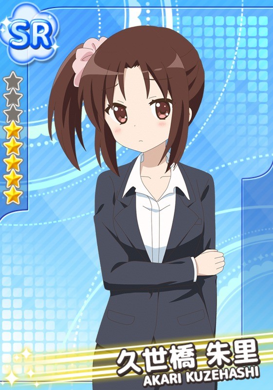 Akari appears somewhat more to be like a beautiful 16-year-old girl than her regular age due to her youthful looks. Sometimes mistaken as a second-year high school student. She has brown hair and brown eyes, and is often seen with her hair pulled into a pony-tail on the side, held up with a pink scrunchy. She wears a formal teachers outfit, which is the business suit, in comparison to Karasuma's more relaxed attire (despite their age difference that normally seniors wear more professionally than juniors just as Kuzehashi is 19 while Karasuma is 21).